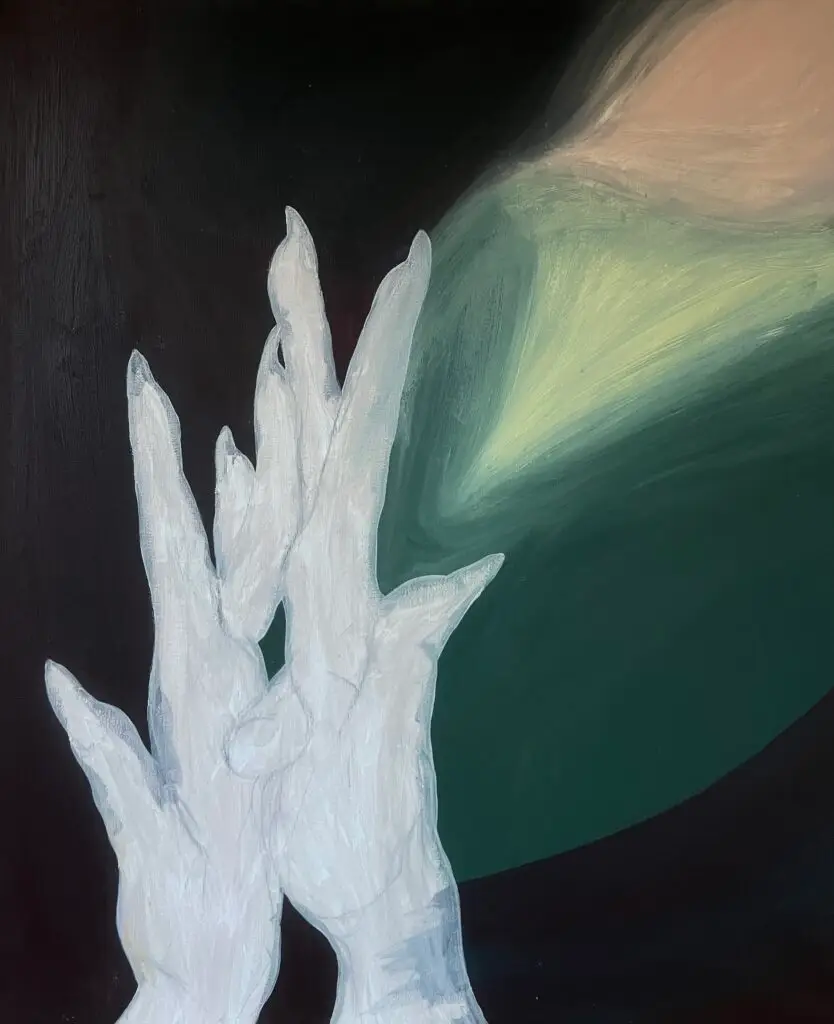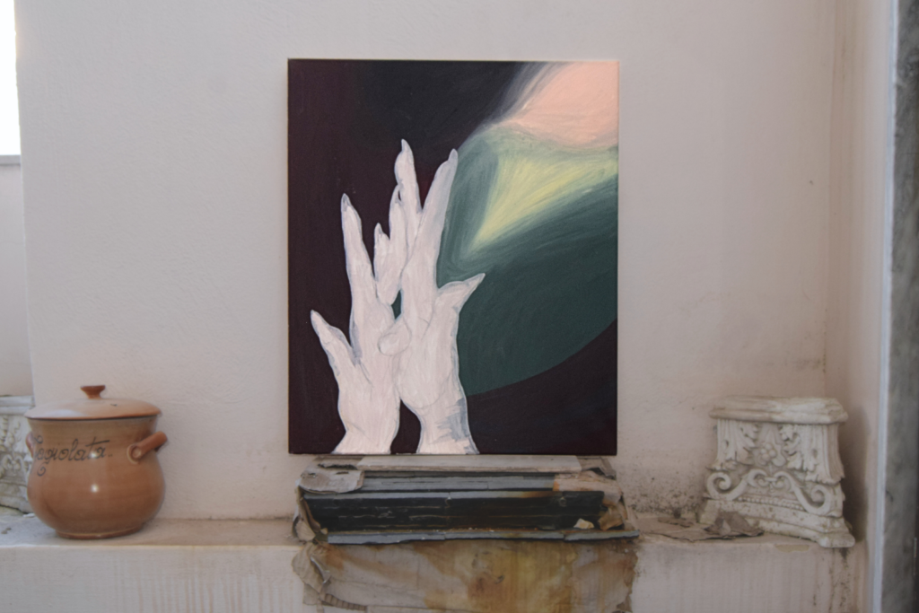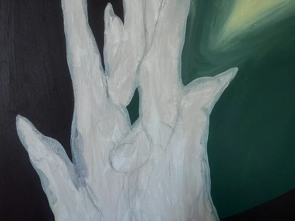 This painting is inspired by this selfie of mine, took with my chin while rolling a middle finger with my hands, during the watching of Szamanka 1996 by Andrzej Zulawski.