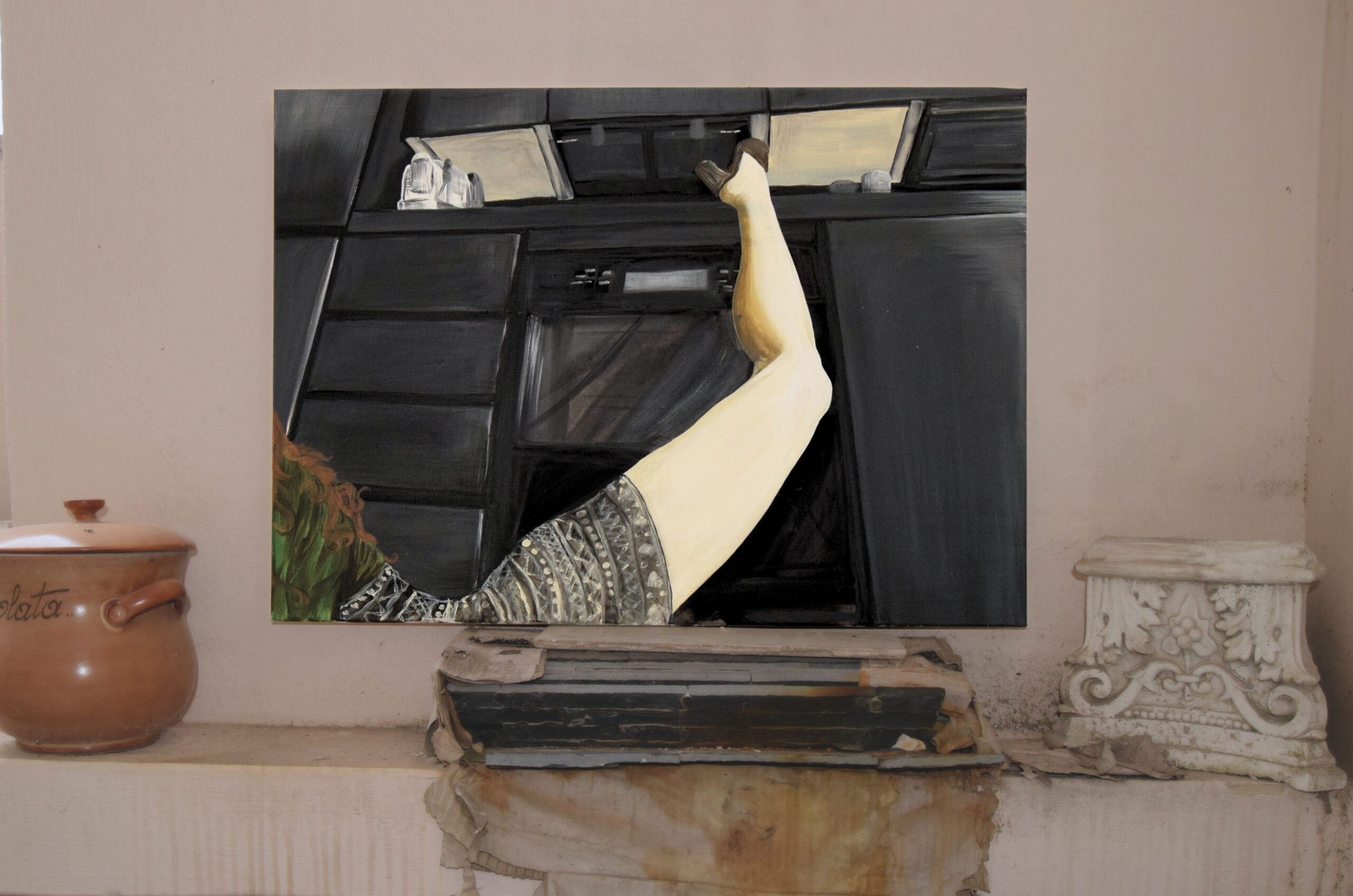 This painting is inspired by a selfie of mine taken in the milanese house I used to live in during covid and where, before me, lived an influencer who designed and picked all the black furnitures.
